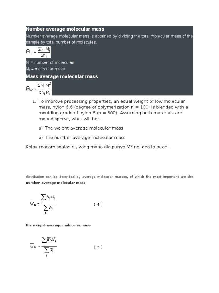 Number average molar mass or m n (also loosely referred to as number average molecular. Multiply each element's atomic mass by the number of atoms of that element in the molecule. Number average molecular weight.let me teach you more! We de ne a quantity , named \mean molecular mass, as = hmi=m p: There is no air molecule, so there is no air molecular weight. Suppose that you have a set of values {x 1, x 2,., x n } for which you calculate an average value. M mixture = (x 1 *m 1 +.+ x n *m n) (1) The molecular weight of the polymer is measured by using viscometer and the molecular weight obtained by this technique is called viscosity average molecular weight. This number is represented by the subscript next to the element symbol in the molecular formula. (3) de ned this way, is numerically equal to the average number of amu's per particle. M w defined as 2.2.16 , where m i is molecular weight of oligomer n, and n i is number of molecules of that molecular weight. Gram molecular mass is the mass in grams of one mole of a molecular substance. In this case ni= 100.